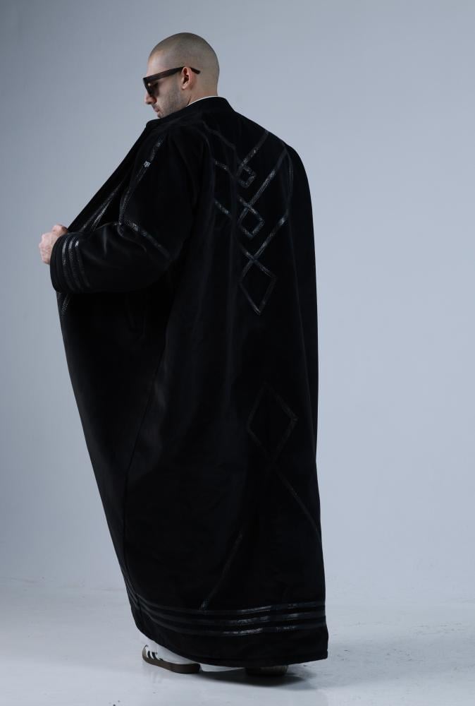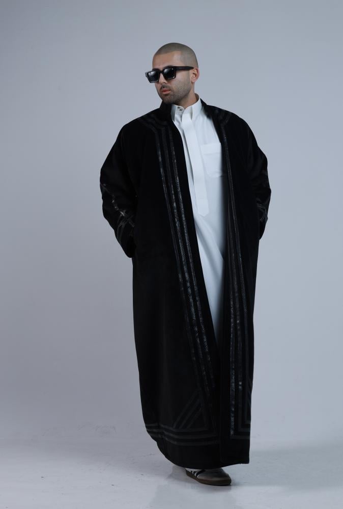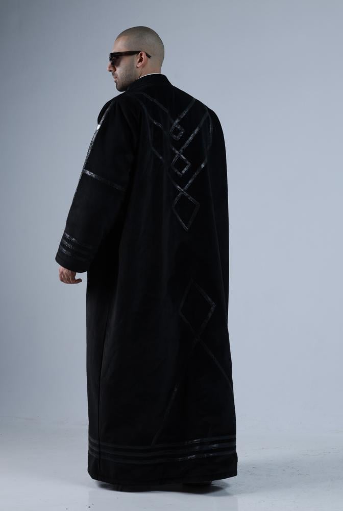 فروة فاخرة القماش جوخ اسود مبطنه فرو ومحددة جلد اسود